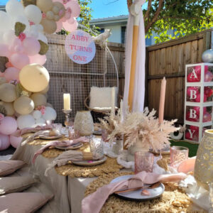 Set up and pack down, rugs, picnic tables, cushions, table runners/table cloths, placemats, plates, forks, wine glasses, cloth napkins, table decor, personalized sign and easel, boho umbrella and drink bucket.