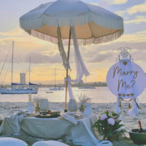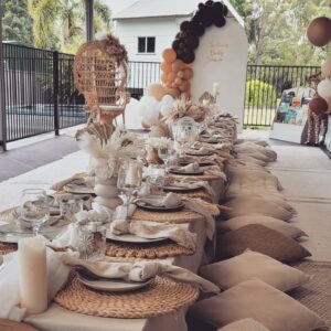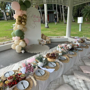 Set up and pack down, rugs, picnic table, cushions, table runners/table cloths, placemats, plates, forks, wine glasses, cloth napkins, table decor, personalised sign and easel, boho umbrella and drink bucket.